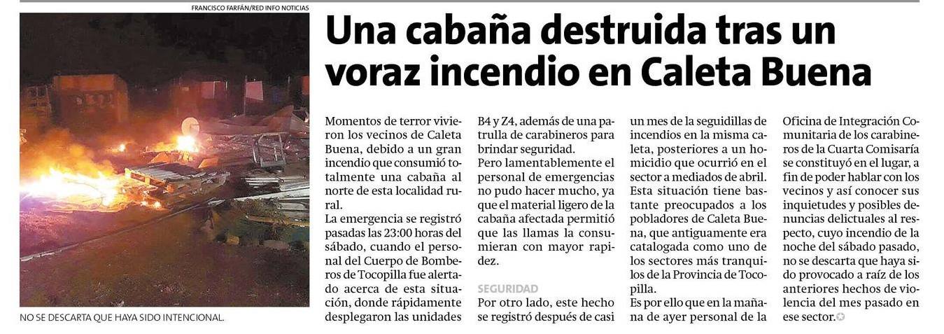 Desde hace un tiempo atrás Caleta Buena, distante a 40 kilómetros al sur de Tocopilla, comenzó a perder la tranquilidad característica que tienen las comunidades costeras del Litoral de la provincia a causa de un notorio incremento de consumo y tráfico de drogas y un rápido incremento de asentamientos de personas que se instalaban precariamente en la zona, situación que coincidió con el incremento de robos y enfrentamientos entre grupos que involucraban hombres y mujeres. Estas situación se desbordó cuando en una riña muere un hombre adulto como resultado de un arponazo, ocurrido en abril de 2017. Este hecho derivó en una serie de incendios a cabañas que, de acuerdo a las indagaciones policiales, son parte de la misma cadena de violencia.